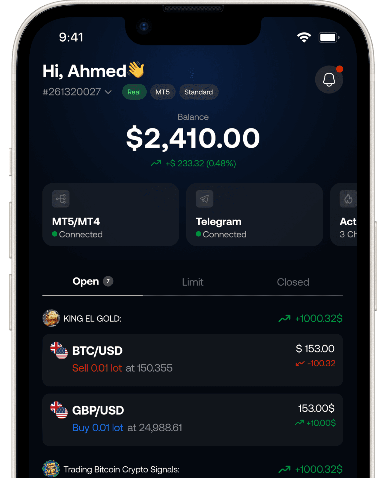 Create your account, connect Telegram and MT4/MT5, then decide how signals should be filtered and executed.